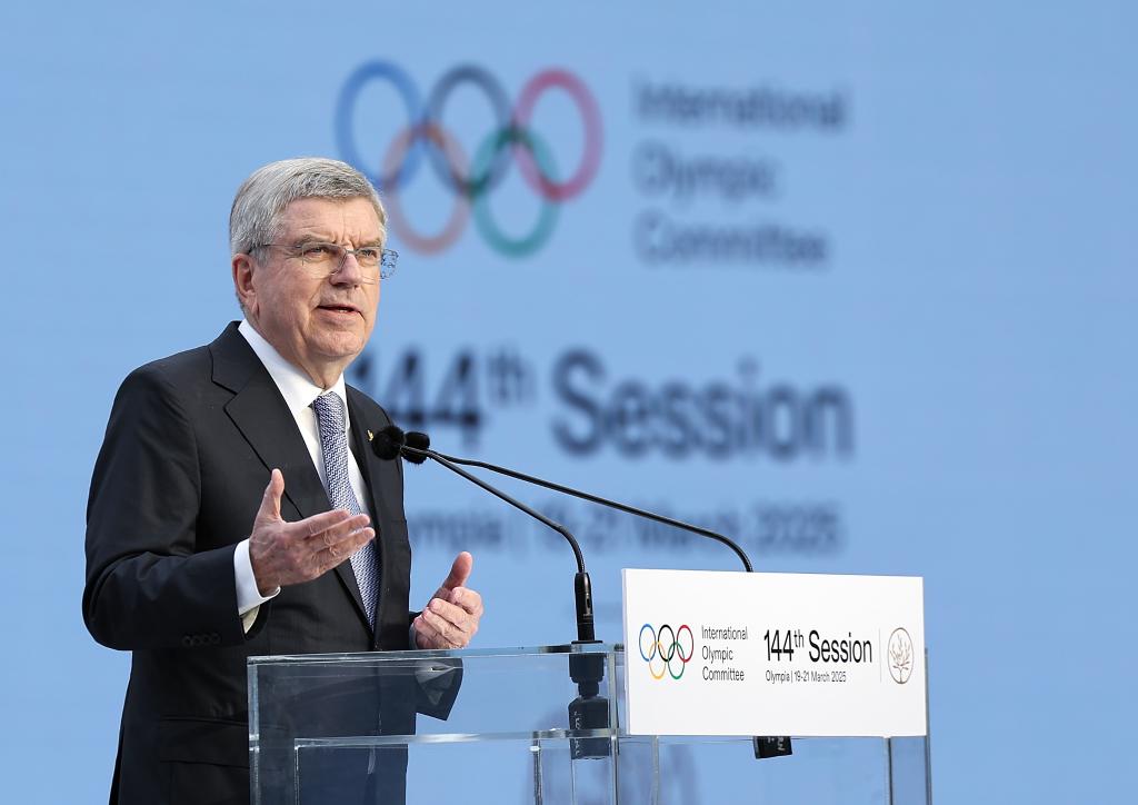 3月18日,国际奥委会主席托马斯·巴赫在开幕式上致辞。当日,国际奥委会第144次全会开幕式在希腊伯罗奔尼撒半岛的古奥林匹亚举行。新华社记者 曹灿 摄