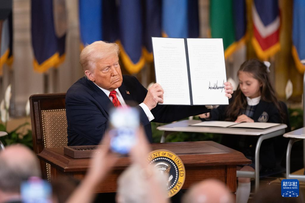 3月20日,美国总统特朗普在华盛顿白宫展示签署的行政令。新华社记者 胡友松 摄