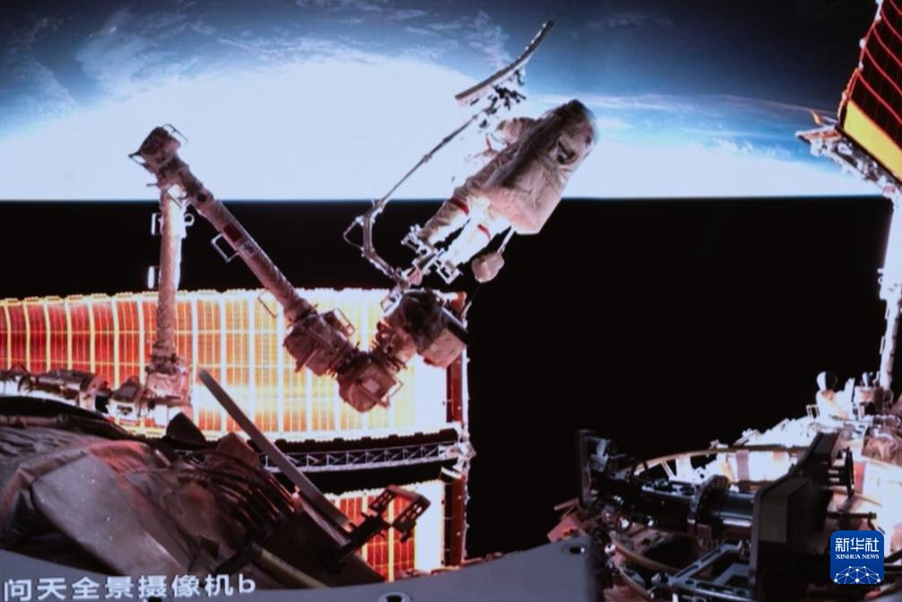 3月21日在北京航天飞行控制中心拍摄的神舟十九号航天员蔡旭哲在空间站组合体舱外工作的画面。新华社记者 李明刚 摄