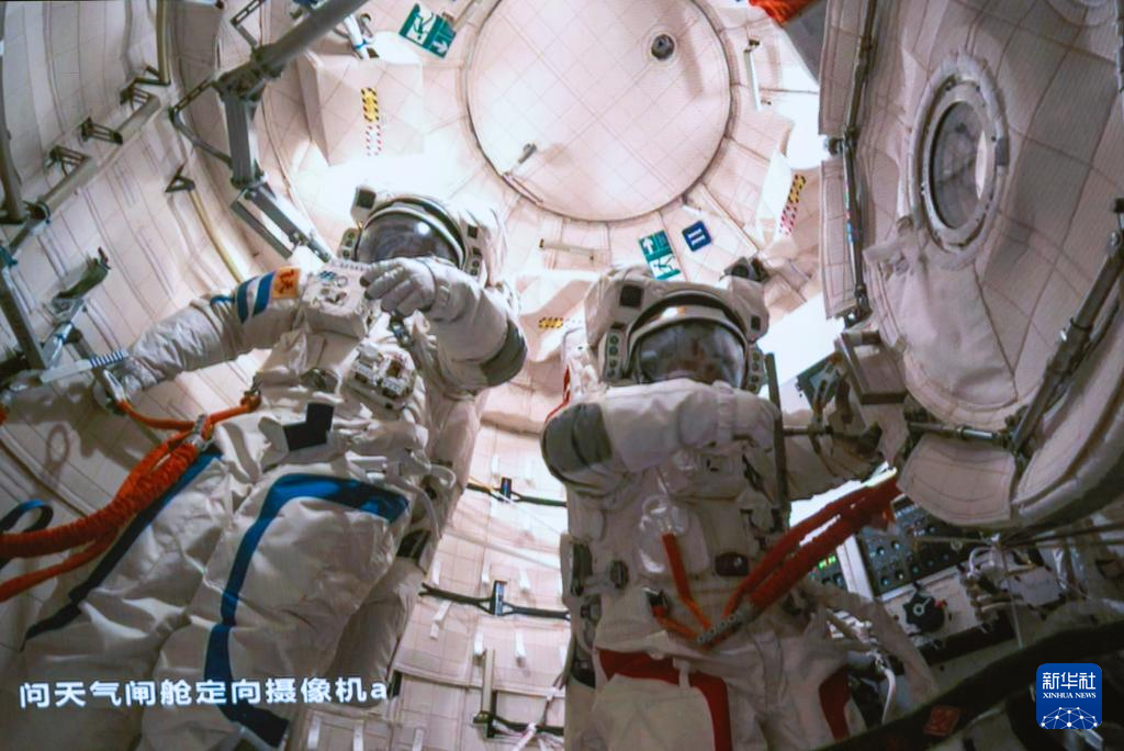 3月21日在北京航天飞行控制中心拍摄的神舟十九号航天员蔡旭哲(右)、宋令东在气闸舱内做出舱准备的画面。新华社记者 李明刚 摄