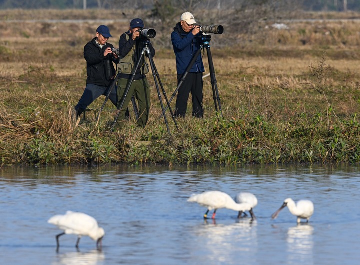 观鸟爱好者在儋州湾湿地拍摄黑脸琵鹭。新华社记者 蒲晓旭 摄