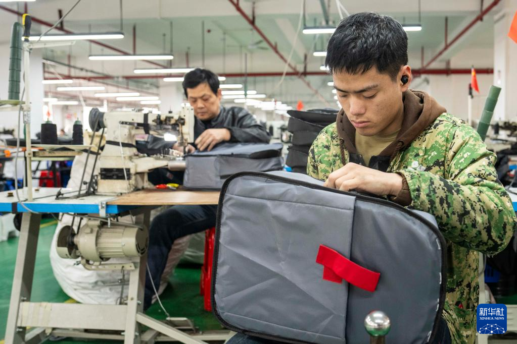 在湖南沅江长盈皮具有限责任公司,工人在制作出口非洲的双肩包(3月12日摄)。新华社记者 陈思汗 摄