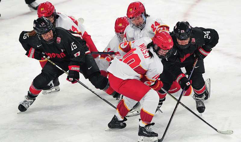 中国队球员吴思嘉(前左)在第九届亚冬会女子冰球小组赛A组比赛中拼抢(2025年2月14日摄)颜麟蕴摄/本刊
