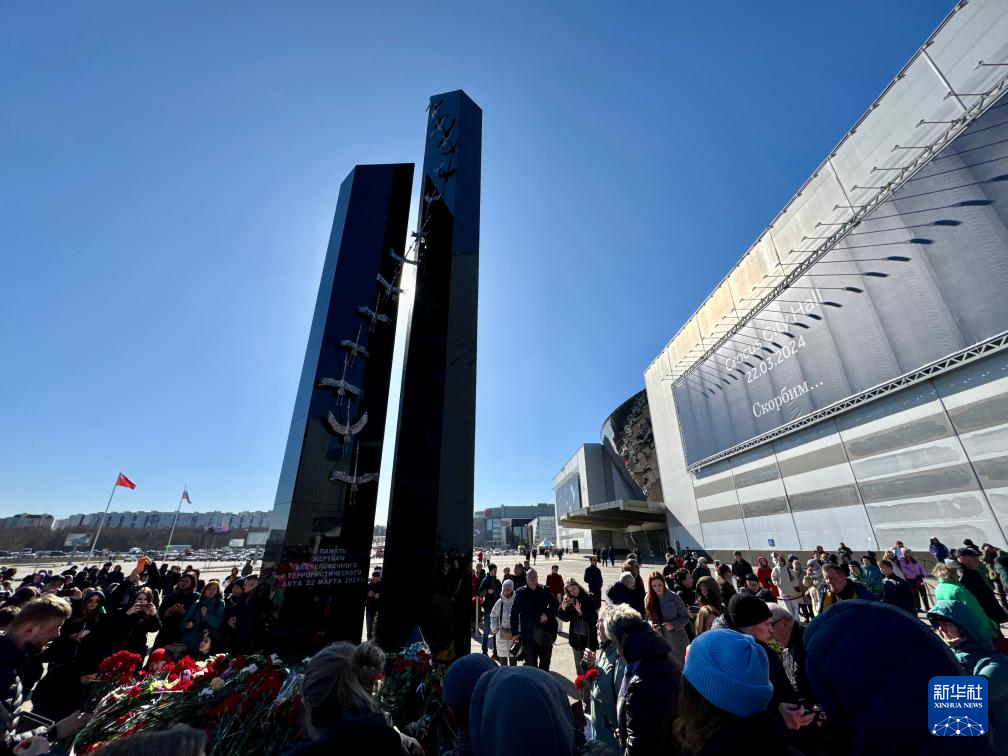 3月22日,在俄罗斯首都莫斯科近郊,人们在“克罗库斯城”音乐厅恐袭事件遇难者纪念碑旁参加悼念活动。新华社发(亚历山大摄)