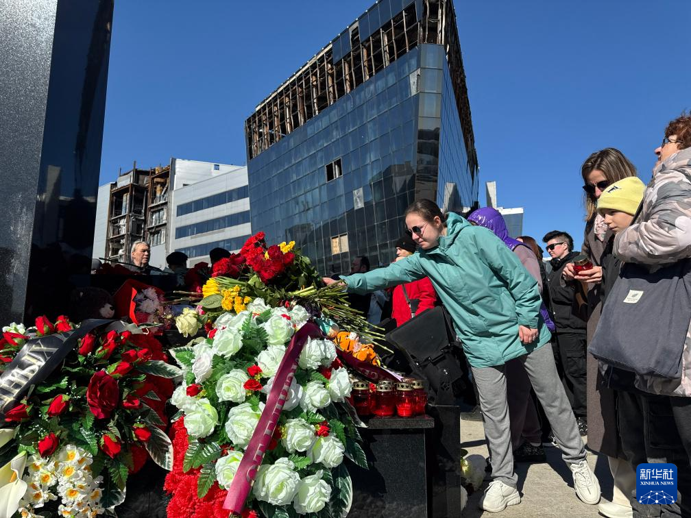 3月22日,在俄罗斯首都莫斯科近郊,人们向“克罗库斯城”音乐厅恐袭事件遇难者纪念碑献花。新华社发(亚历山大摄)