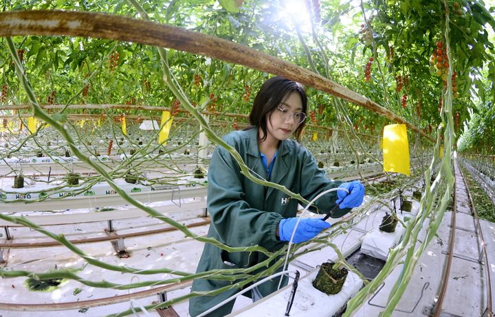2025年2月19日,技术人员在宏福农业大兴园区的智能温室中检测智能节水管道。新华社记者 李欣 摄