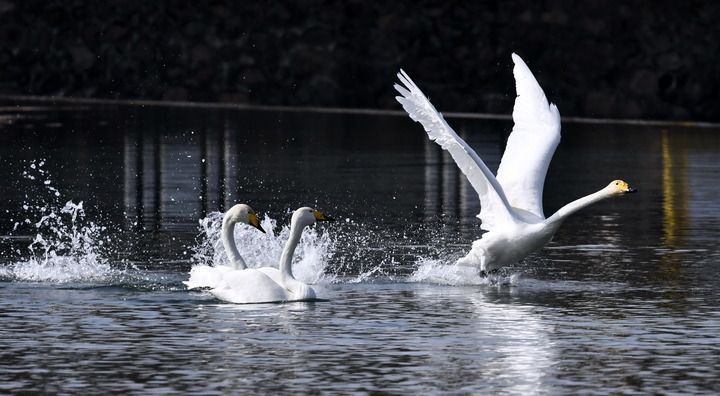 2025年3月4日,天鹅在密云水库流域的清水河戏水觅食。新华社记者 李欣 摄