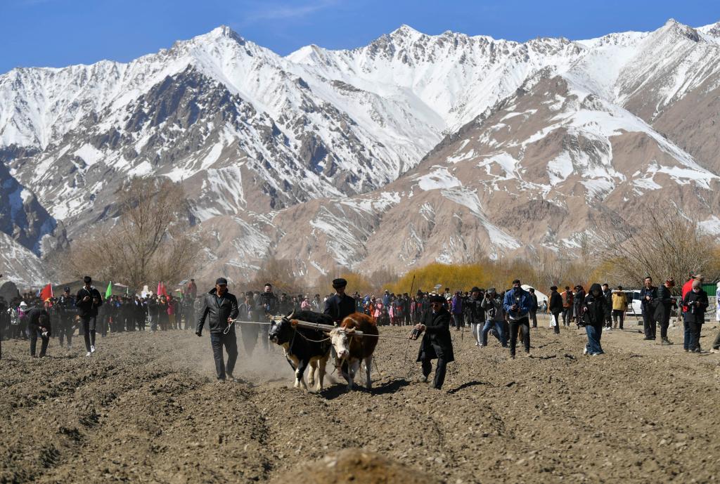 塔县居民向游客展示传统的“二牛抬杠”犁地方式。新华社记者 胡虎虎 摄