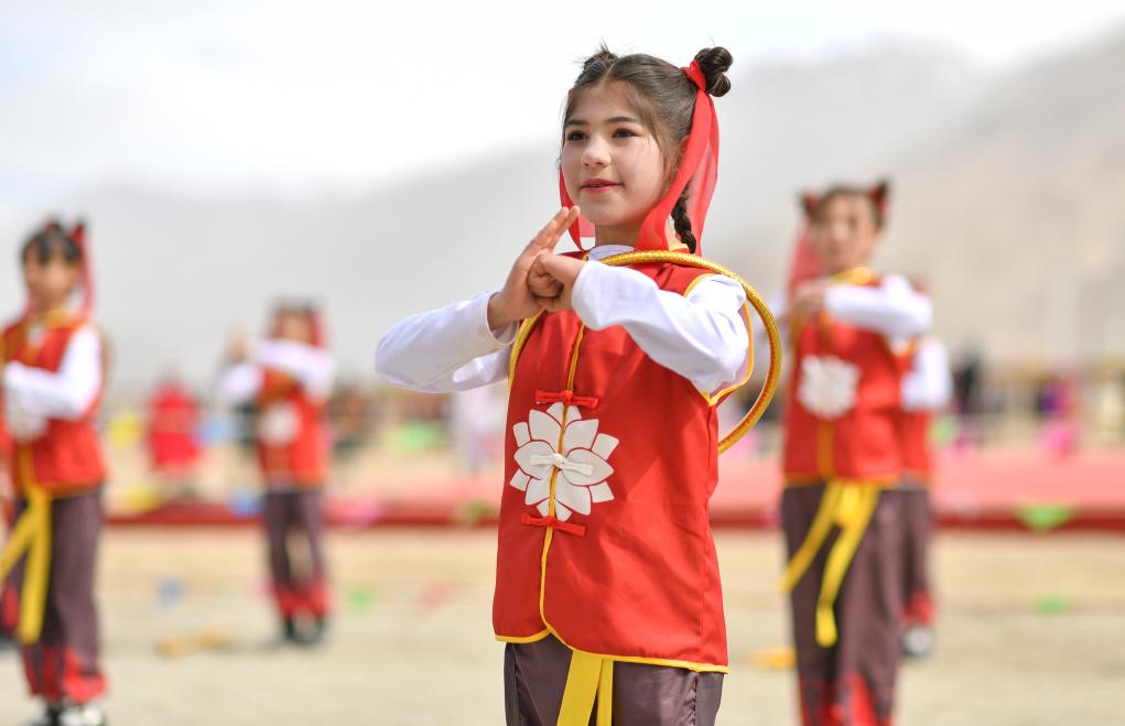 古丽阿依木·依不拉依木江和同学们在文旅活动上表演节目。新华社记者 胡虎虎 摄