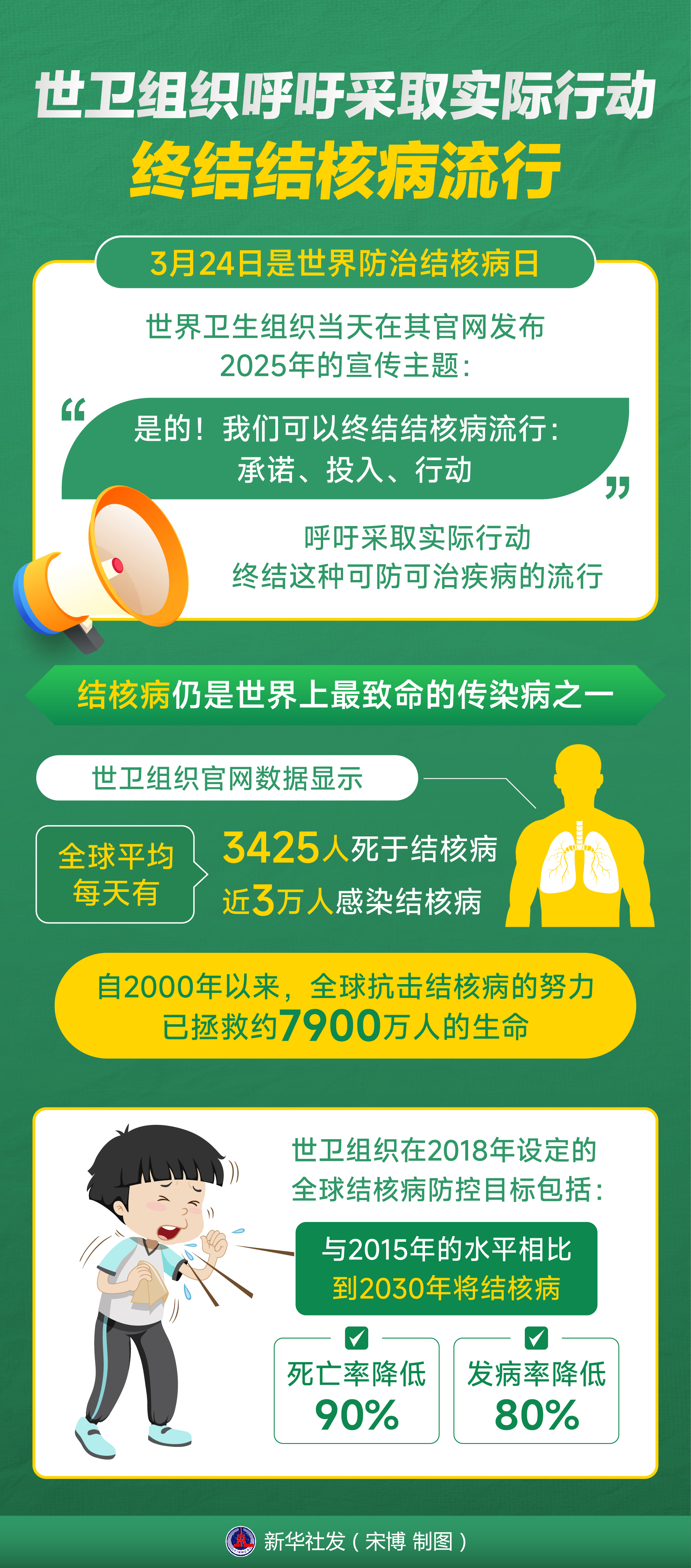 新华社日内瓦3月24日电 3月24日是世界防治结核病日,世界卫生组织当天在其官网发布今年的宣传主题:“是的!我们可以终结结核病流行:承诺、投入、行动”,呼吁采取实际行动终结这种可防可治疾病的流行。