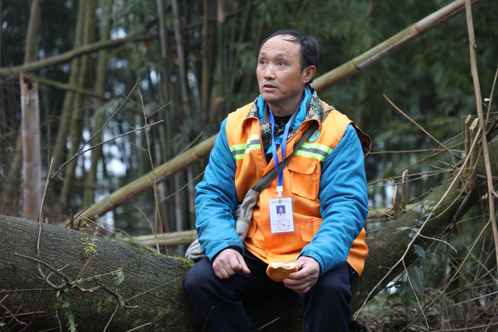黄宗友在巡山途中吃干粮。新华社发(孔菲 摄)