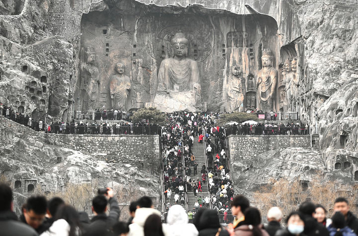 2025年1月31日,游客在河南洛阳龙门石窟景区参观游览。新华社发(黄政伟 摄)
