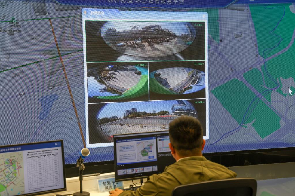 它们能够自主识别垃圾、自动返回基站倒垃圾并加水,与环卫工协同配合完成复杂道路清扫工作……机器人在路面忙碌的同时,街道指挥中心的大屏显示它们的实时轨迹和状态,供工作人员随时“调兵遣将”。