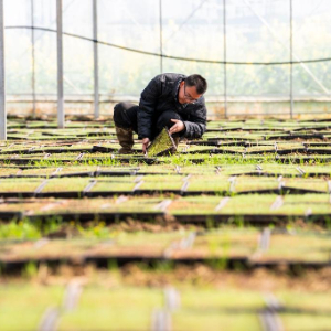 3月20日,在常德市汉寿县龙潭桥镇兴龙社区,刘含在育秧大棚观察秧苗长势。新华社记者 陈思汗 摄