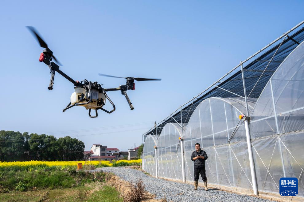 3月20日,在常德市汉寿县龙潭桥镇兴龙社区,刘含测试农用无人机。新华社记者 陈思汗 摄