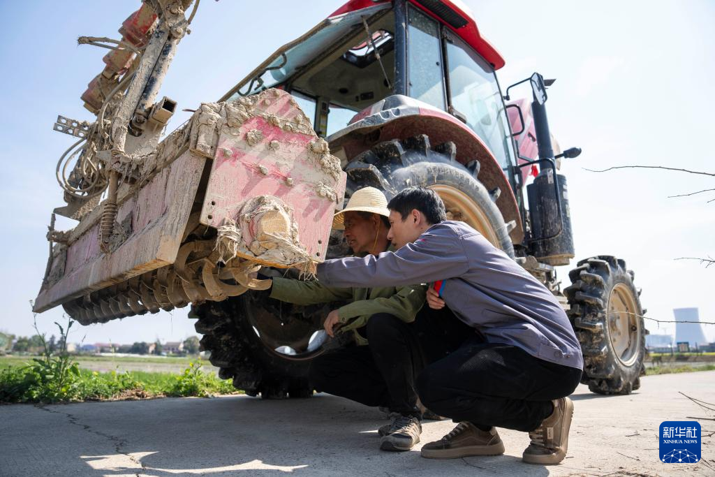 3月19日,在益阳市资阳区新桥河镇廖河村,姚帅(右)向农机手讨教农机方面的专业知识。新华社记者 周勉 摄