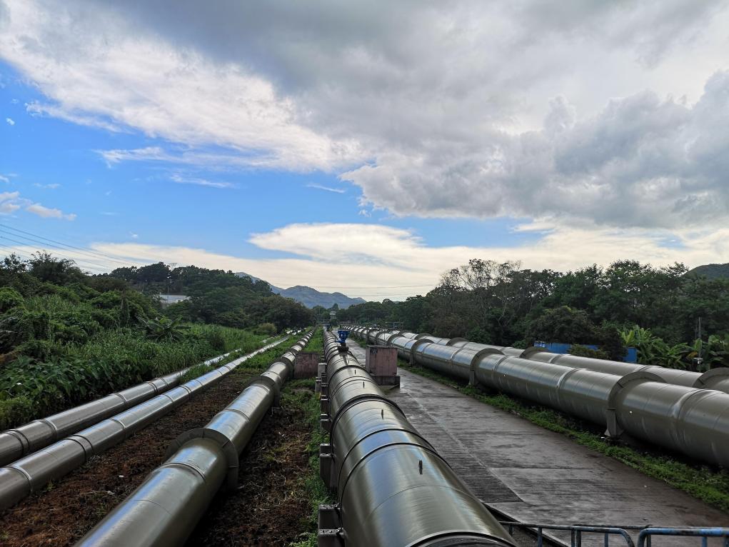 东江水抵港第一站是位于香港上水的木湖原水抽水站,它是香港配合东江供水工程而兴建的重要设施。这是木湖原水抽水站的巨型输水管(资料照片)。新华社发(香港特别行政区政府水务署供图)