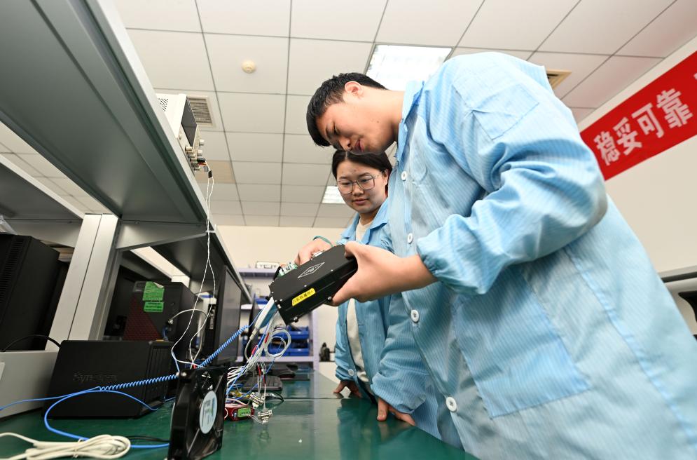 3月21日,天津云遥宇航科技有限公司工作人员在检查一款卫星的核心部件。新华社记者赵子硕 摄