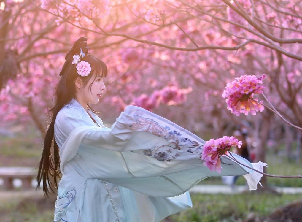 3月11日,游人身着汉服在湖北省武汉市龙华寺景区赏花拍照。 新华社发(赵军摄)