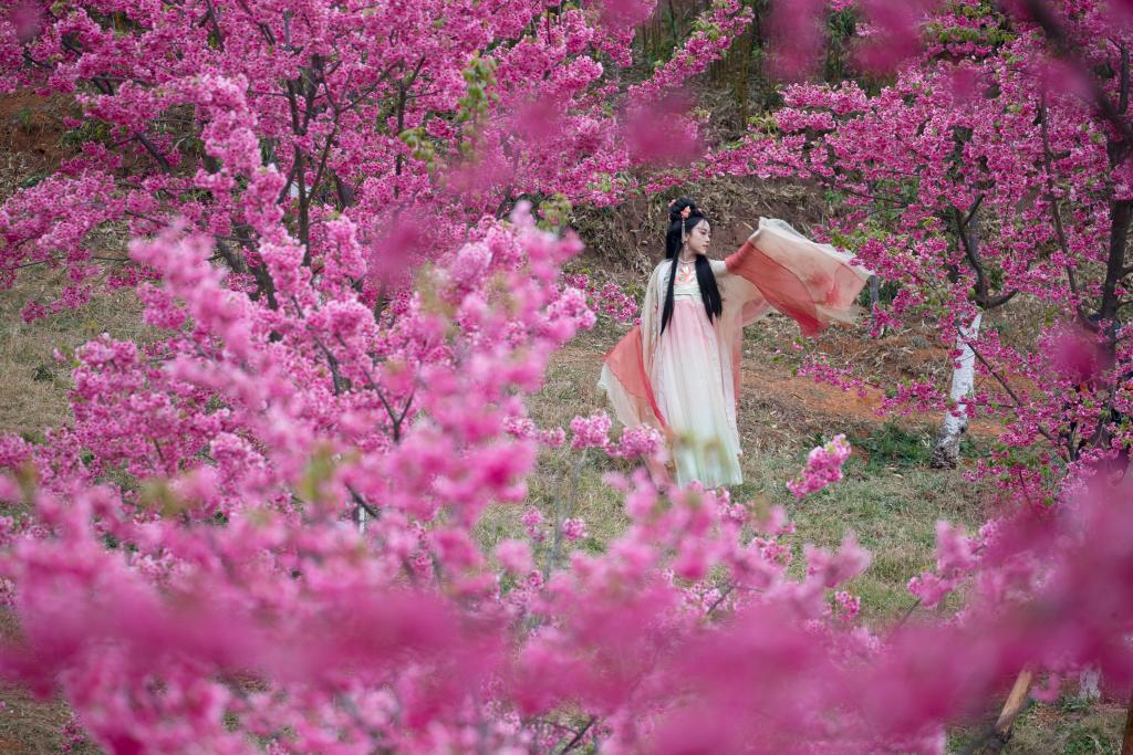 3月15日,一名女子在云南省曲靖市马龙区樱花谷留影。新华社发(杨俊鹏摄)