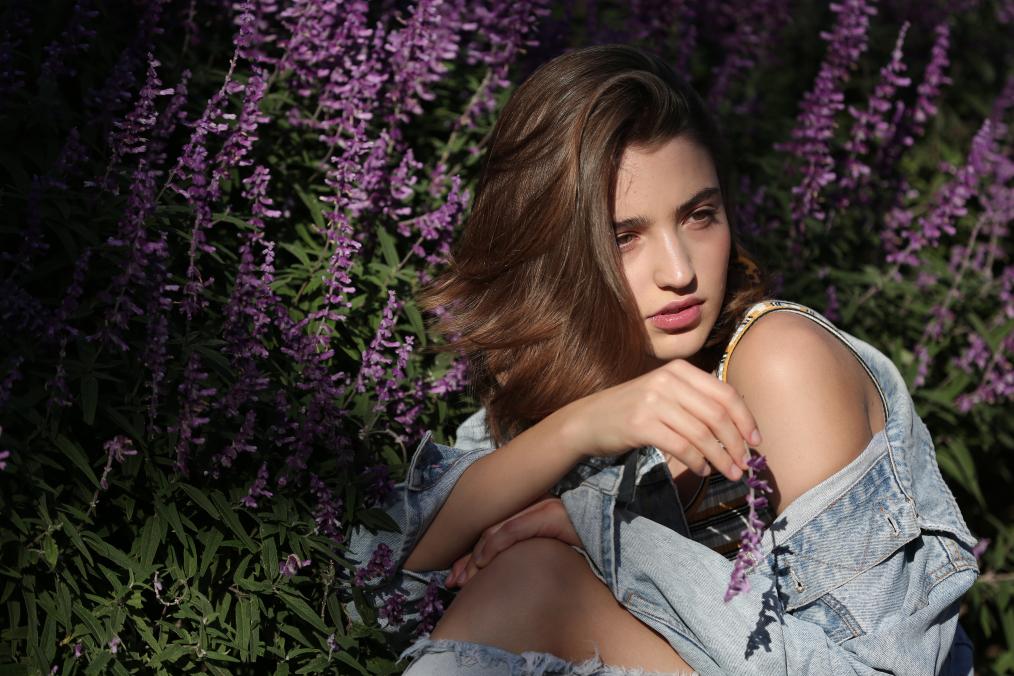 三分法构图:将人物放在画面1/3处,头顶留出花枝舒展的空间