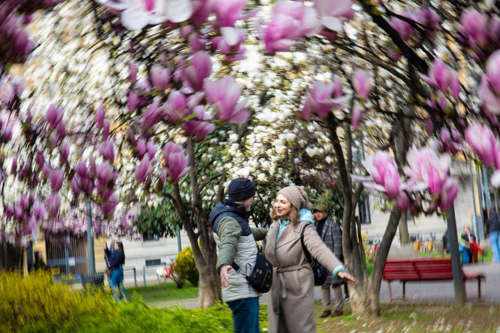 3月18日,在意大利米兰,人们在街心公园观赏玉兰花。 新华社记者 李京 摄