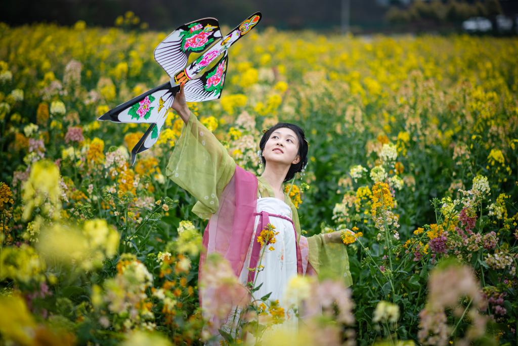 ↑加入道具拍摄,能为春日赏花人像增添多维度的表现力,既能强化主题,又能提升互动感与艺术性。手持风筝、透明伞或花篮等道具,能平衡构图,同时道具颜色可与花卉形成对比,增强视觉层次。手持风车等道具让人物有具体动作,避免“手不知往哪放”的僵硬感。
