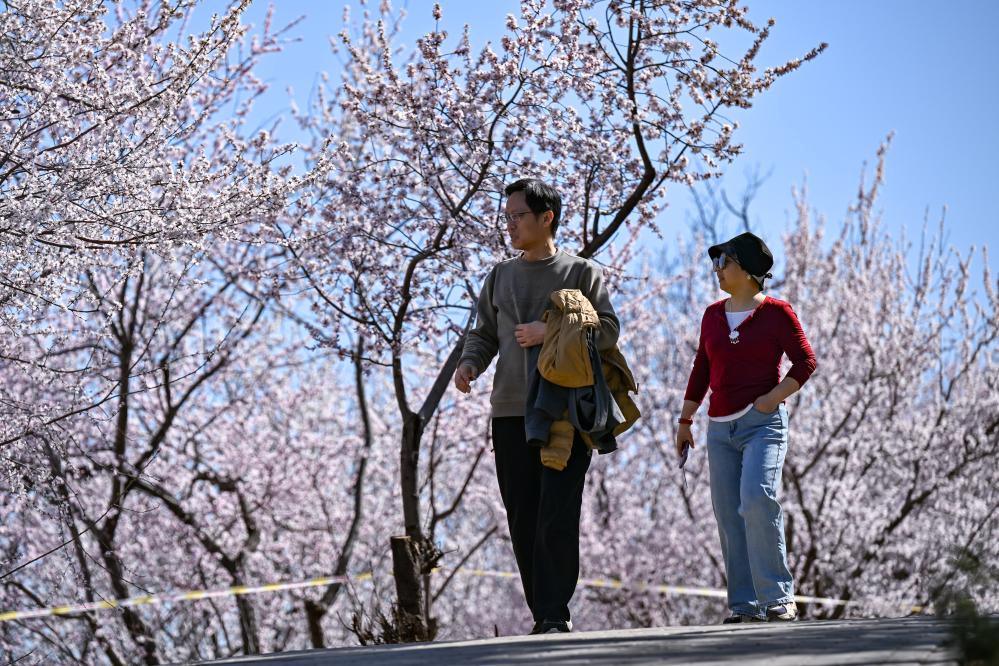 3月19日,游客在北京老山城市休闲公园踏青赏花。新华社记者 张铖 摄