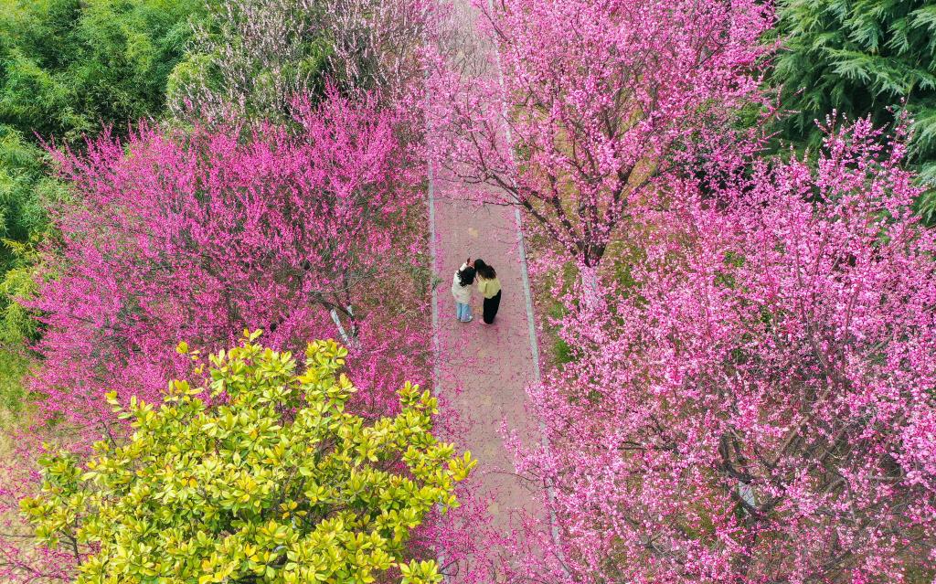 ↑无人机捕捉花海,呈现出在地面拍摄时无法企及的几何美感。梅花林形成的粉色点阵,游人与小径点缀其中,画面中的你顿时成为这春日美景不可或缺的一部分。