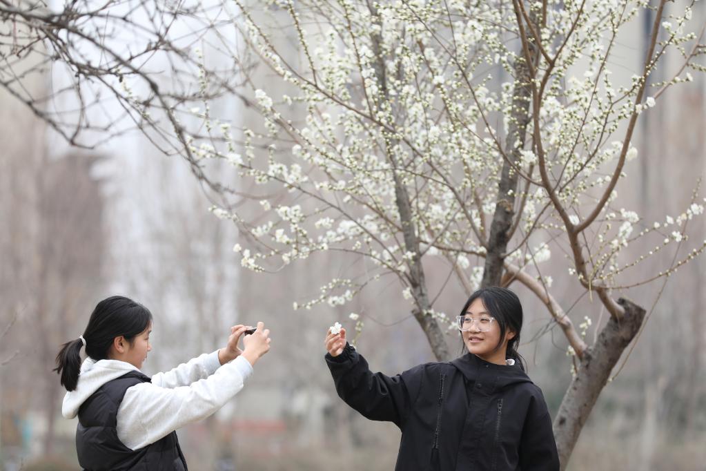 3月15日,市民在河南省焦作市温县子夏公园赏花拍照。 新华社发(徐宏星摄)