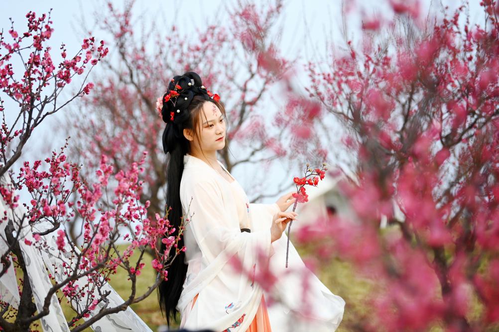 2月25日,古风爱好者在陕西省西安市秦岭终南山脚下长安唐村梅园内留影。新华社记者 刘潇 摄