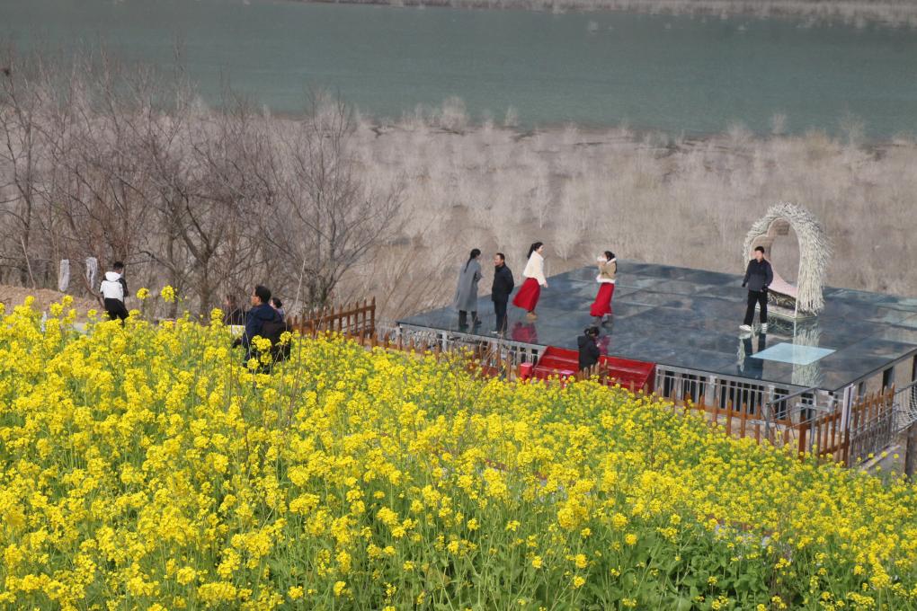 甘肃玉垒坪村黄灿灿的油菜花蔓延开来,游客们纷纷拍照留念,品味春意。新华社记者李杰 摄