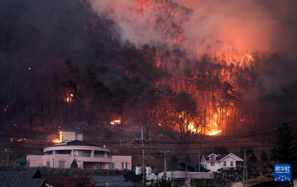 3月25日晚,山火蔓延至韩国庆尚北道安东的村庄。新华社/纽西斯通讯社