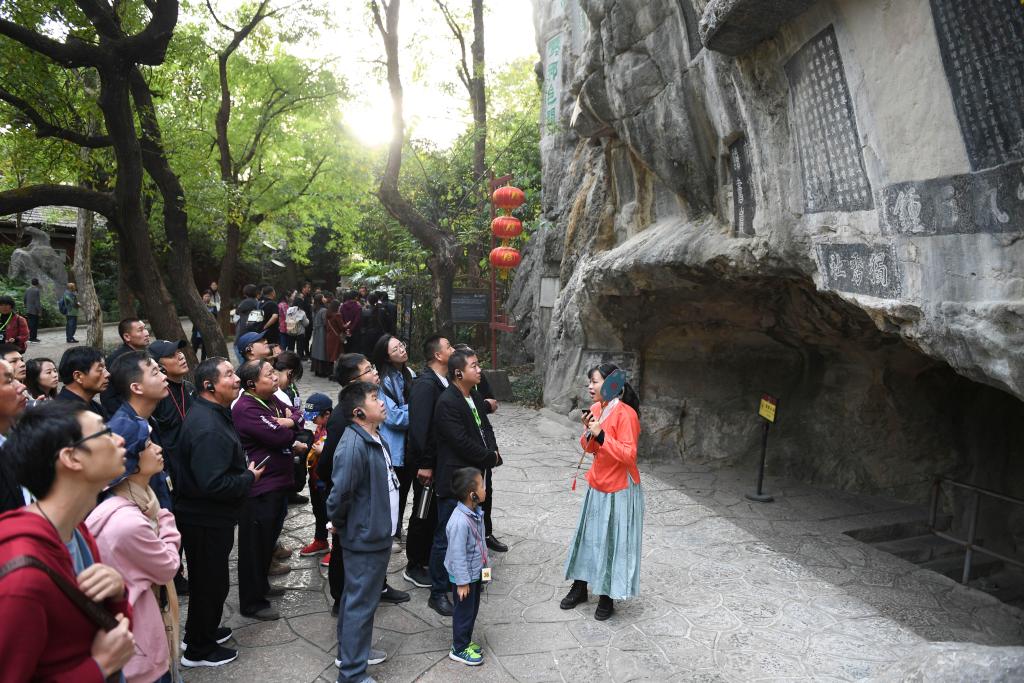 2019年11月20日,游客在桂林市独秀峰·王城景区内观看摩崖石刻。新华社记者 曹祎铭 摄
