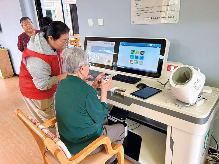 老人在天津市东丽区金桥街道综合养老服务中心使用智能设备进行身体检查。新华社记者尹思源 摄