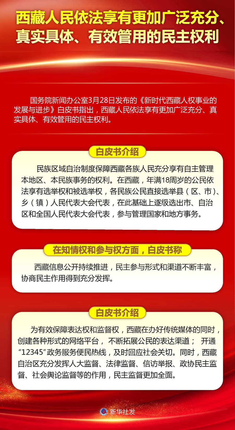 在知情权和参与权方面,白皮书称,西藏信息公开持续推进,民主参与形式和渠道不断丰富,协商民主作用得到充分发挥。