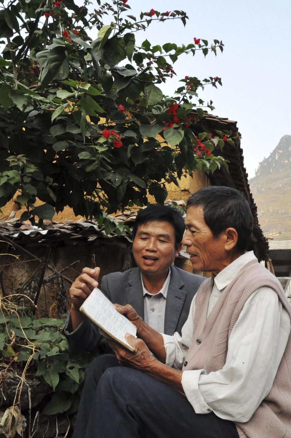 2010年11月11日,在广西马山县古零镇安善村下安屯,温桂元(右)和儿子温建业在自家院子传唱壮族三声部民歌。组图均由新华每日电讯记者陆波岸 摄
