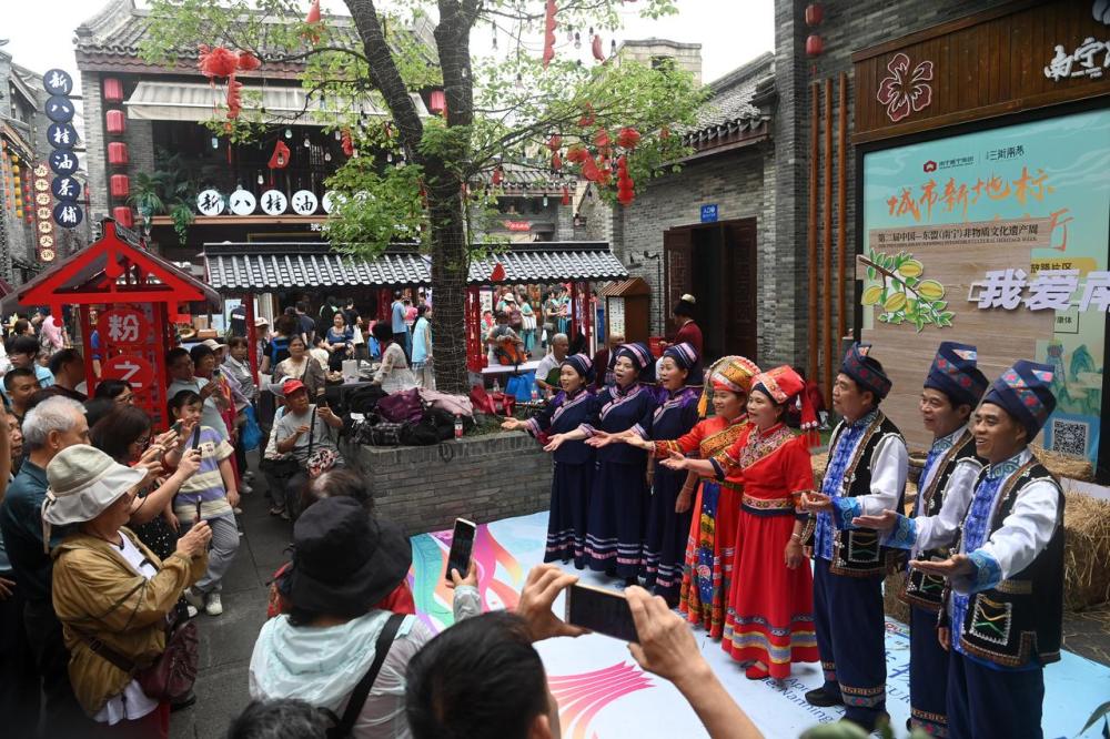 2024年4月13日,在广西南宁市三街两巷,温建业(右三)在和同事一起演唱壮族三声部民歌欢庆“三月三”。