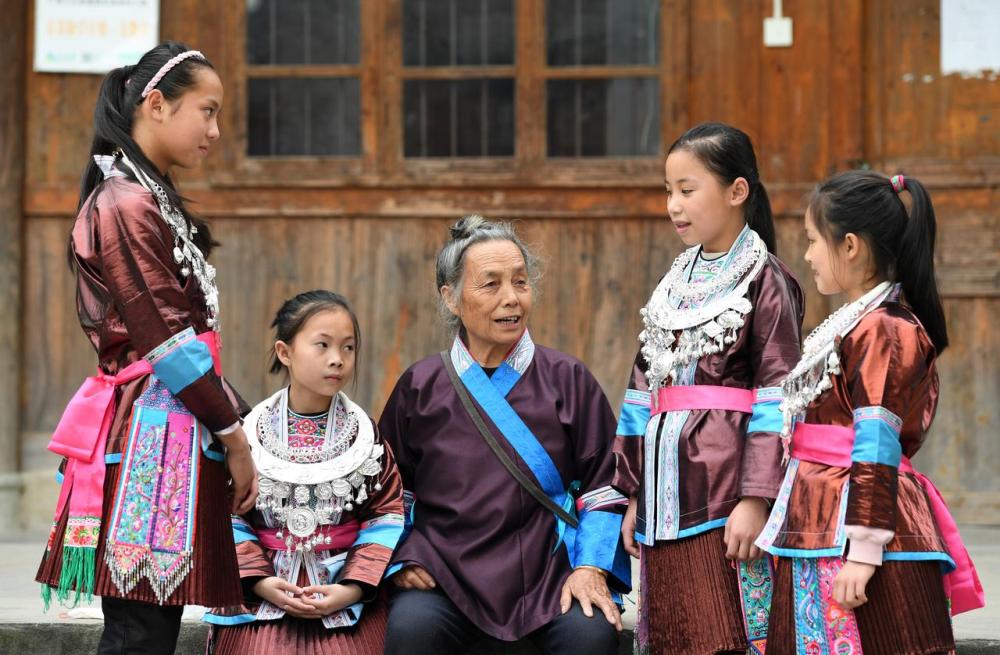 2018年4月26日,在广西三江侗族自治县富禄乡高安小学,覃奶号(中)教学生唱侗族大歌。