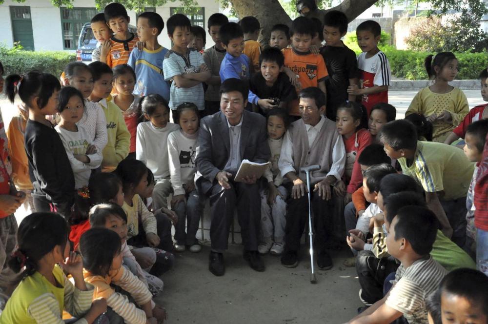 2010年11月11日,在广西南宁马山县古零镇安善小学,温桂元和儿子温建业教小学生唱壮族三声部民歌。