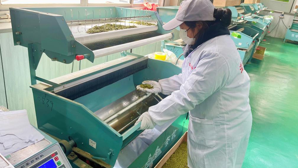 文县溢品茗茶叶种植农民专业合作社生产车间负责人袁素花正在查看茶叶炒制情况。新华社记者李杰 摄