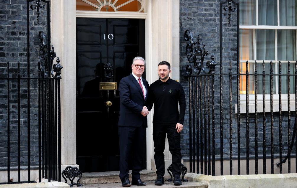 2025年3月1日,在英国伦敦唐宁街10号首相府前,英国首相斯塔默(左)与乌克兰总统泽连斯基握手。新华社记者李颖摄