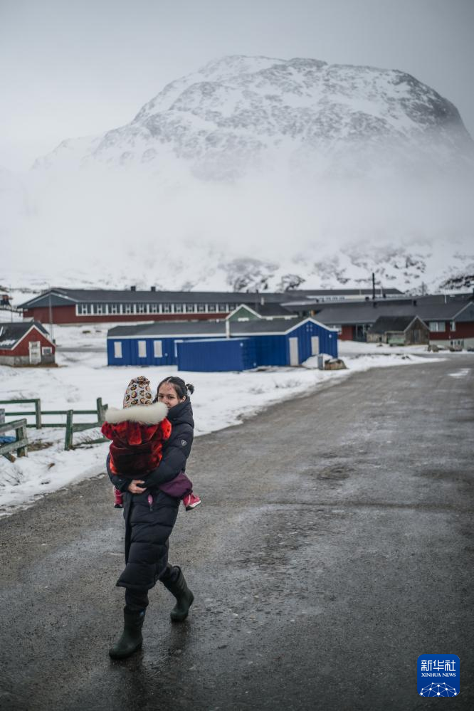 3月22日,在丹麦自治领地格陵兰岛纳尔萨克,一名女子抱着孩子走在路上。新华社记者 彭子洋 摄