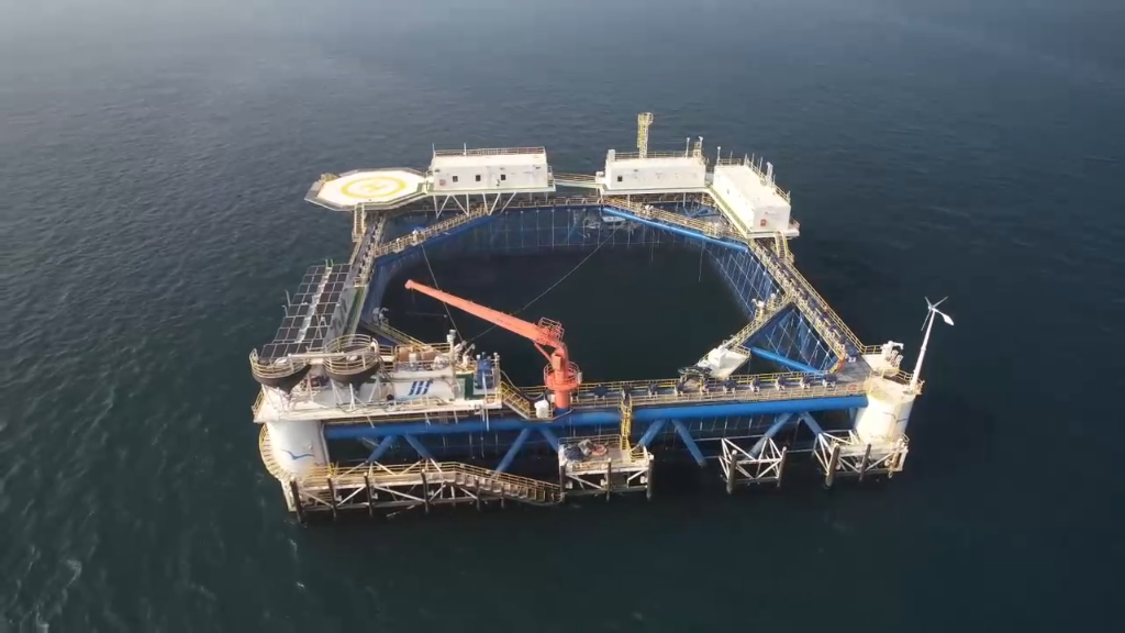 在距离大陆岸线42海里的海域坐落着这样的深远海智能网箱平台,网箱长宽均为68米,布设500个监测点,配备了声纳、激光雷达等设备。这样的1个网箱每年能产出100万条鱼,只需要4个工人来操作。