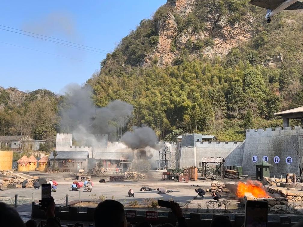 位于大别山腹地的安徽省六安市霍山县落儿岭镇,春日的风掠过草木葳蕤的崖壁,峡谷中忽然迸发出轰隆隆的爆炸声。仿真的战机从人们头顶掠过,硝烟火光中,鹿吐石铺大捷的壮烈场景震撼着上千名观众。