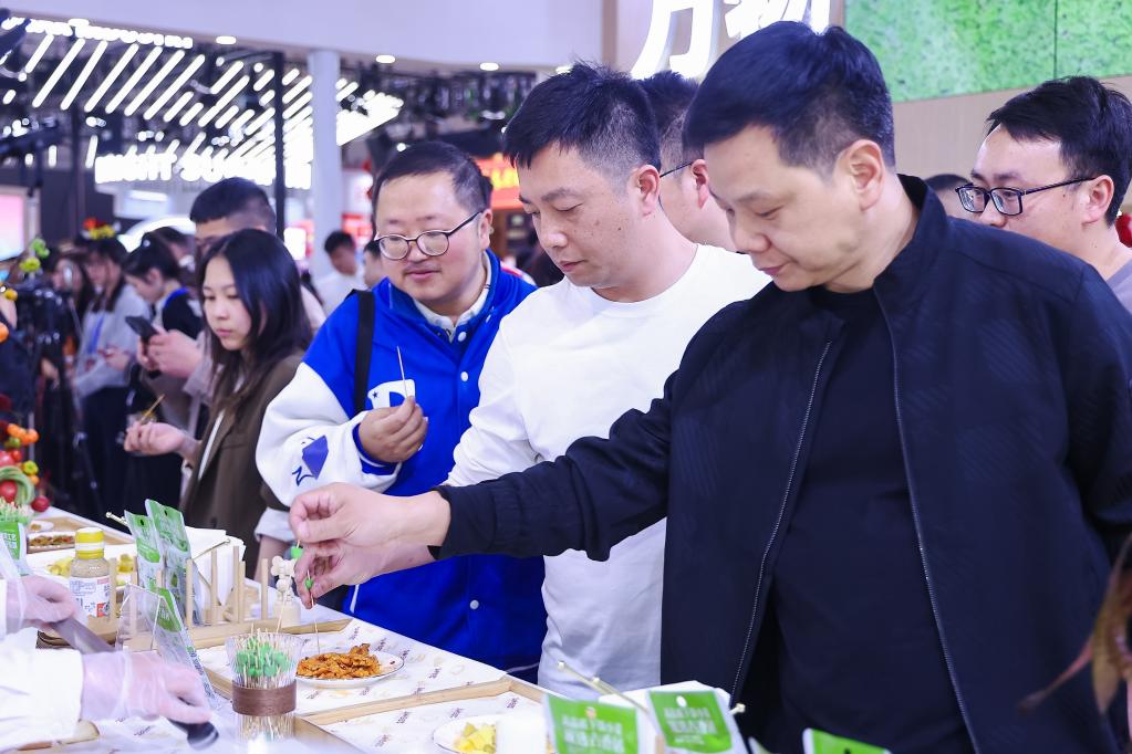 在成都举办的第112届全国糖酒商品交易会上,客商在品尝来自四川眉山的泡菜(3月25日摄)。新华社发