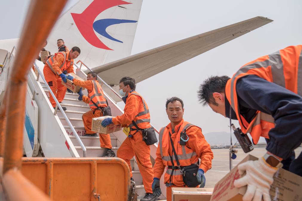 3月30日下午1时50分,距离MU9003次航班飞往缅甸仰光只有十几分钟。昆明长水国际机场的停机坪上,飞机引擎声轰鸣,工作人员正争分夺秒,往飞机上搬运救灾物资。