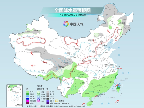 明天,西藏东部、川西高原北部、青海中南部、新疆沿天山地区、内蒙古东北部、黑龙江西北部和东部、吉林东部等地部分地区有小到中雪或雨夹雪,其中,西藏东北部、川西高原北部等地部分地区有大雪。西藏东南部、西南地区东部、江南南部、华南大部、台湾岛等地部分地区有小到中雨,其中,台湾岛北部部分地区有大雨。
