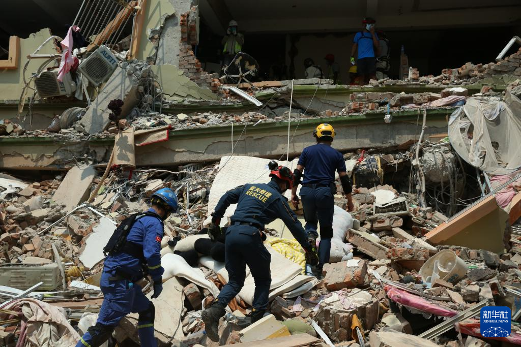 3月30日,在缅甸曼德勒天空别墅公寓建筑群,救援队及志愿者一起开展救援活动。新华社发(苗觉梭摄)