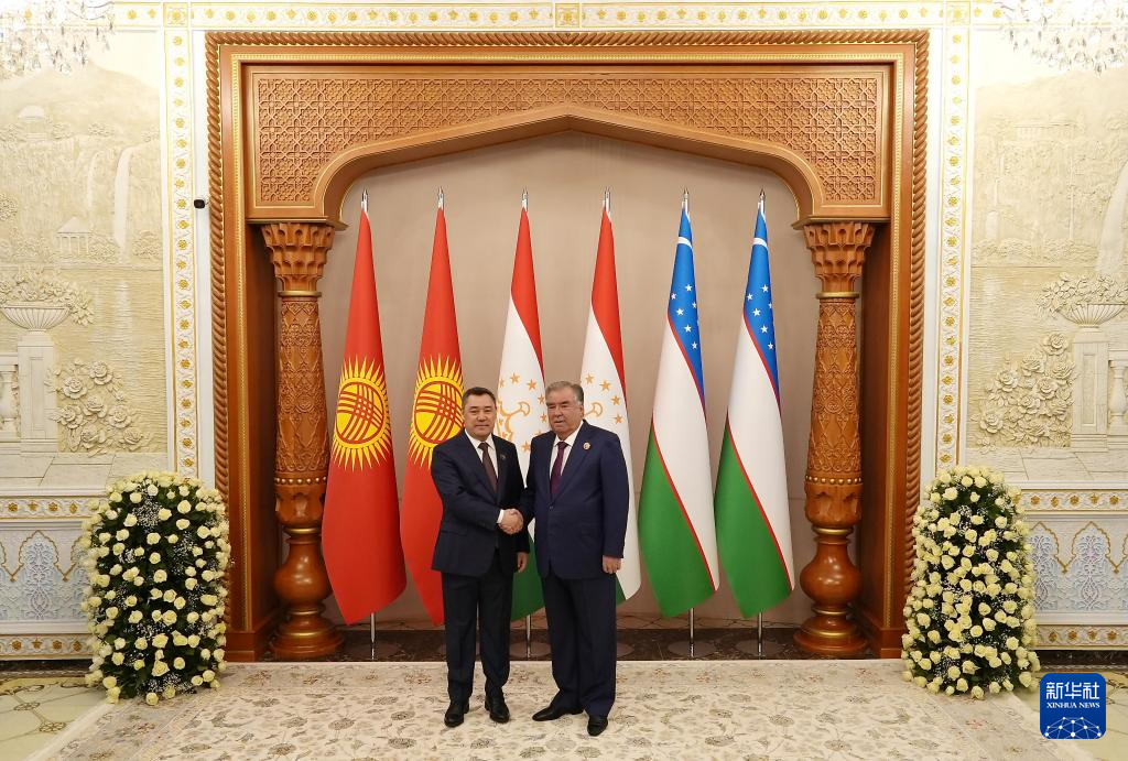 3月31日,在塔吉克斯坦苦盏,塔吉克斯坦总统拉赫蒙(右)与吉尔吉斯斯坦总统扎帕罗夫握手。新华社发(扎法尔摄)